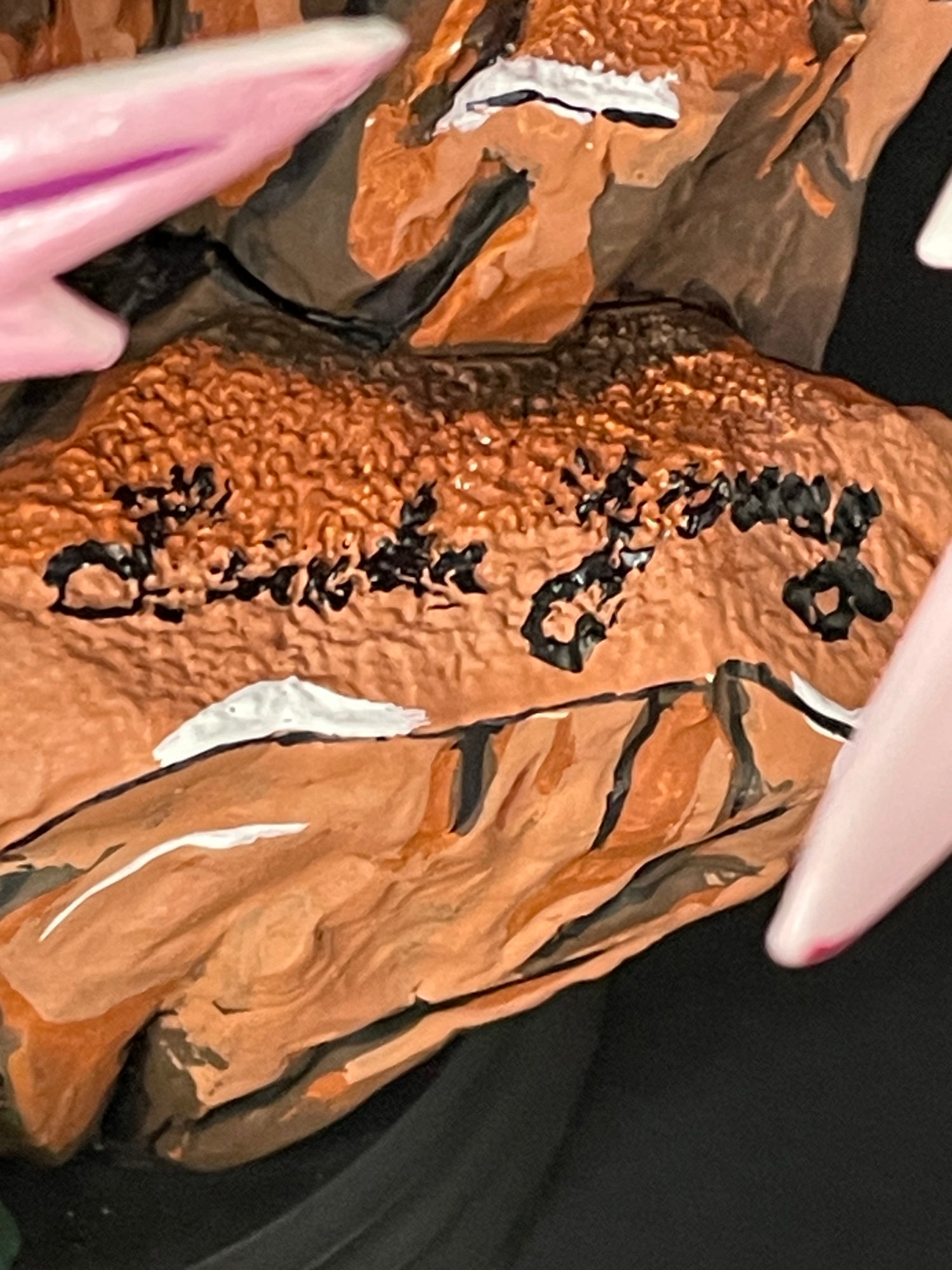 This Frieza PVC figure is hand painted by the famous anime artist MrAnimeWorks1. This figure has been painted in the cel shaded style and looks amazing on any display. This figure blends well against matte black backgrounds creating an almost 2 dimensional look to the item. This figure was taken with us to Dothan Alabama to the Dothan AnimeFest in the Summer of 2024, where we met Frieza voice actress Linda Young. She was generous enough to sign the piece. This is a ONE of a kind painted piece. A MUST have for any DBZ fan. Especially Frieza fans.